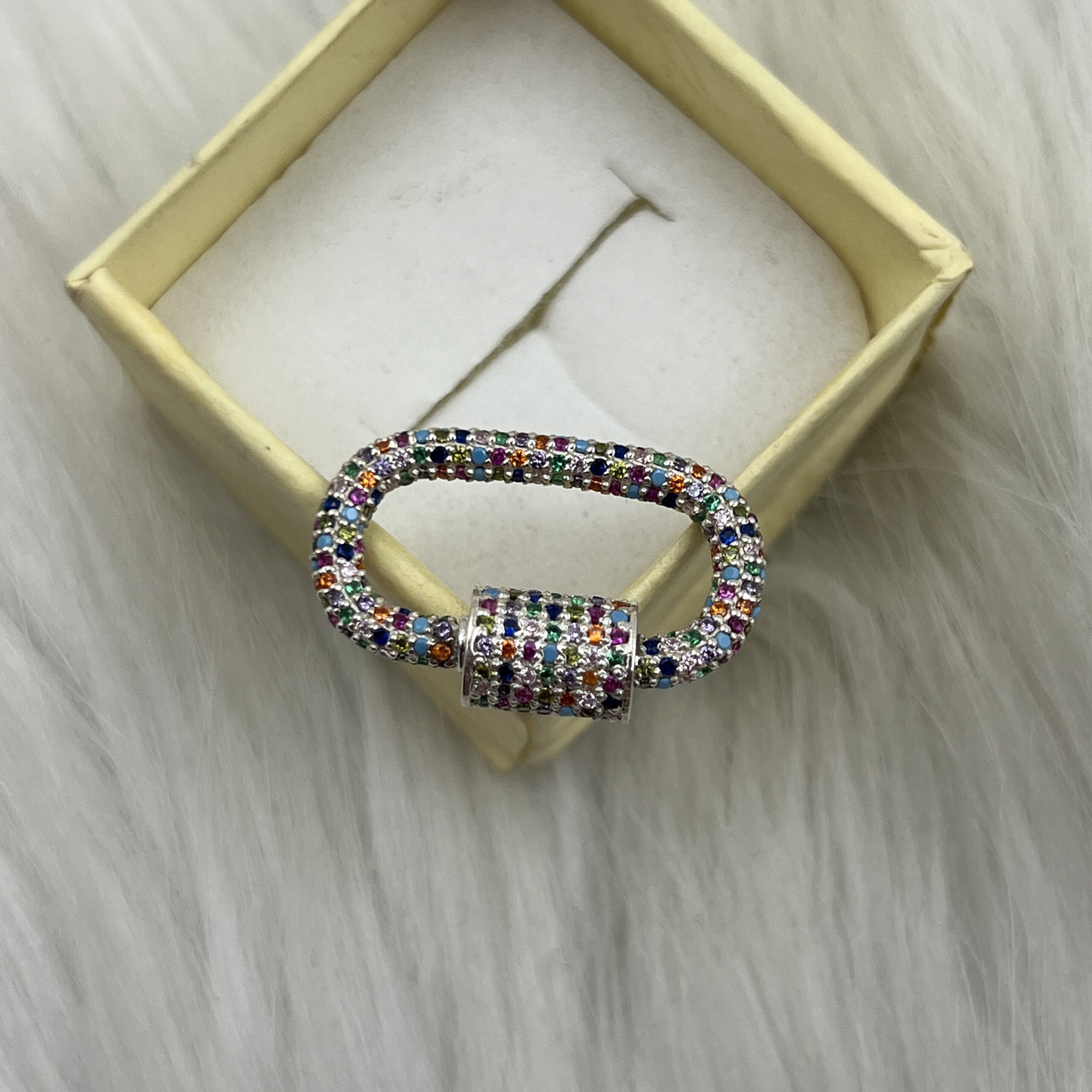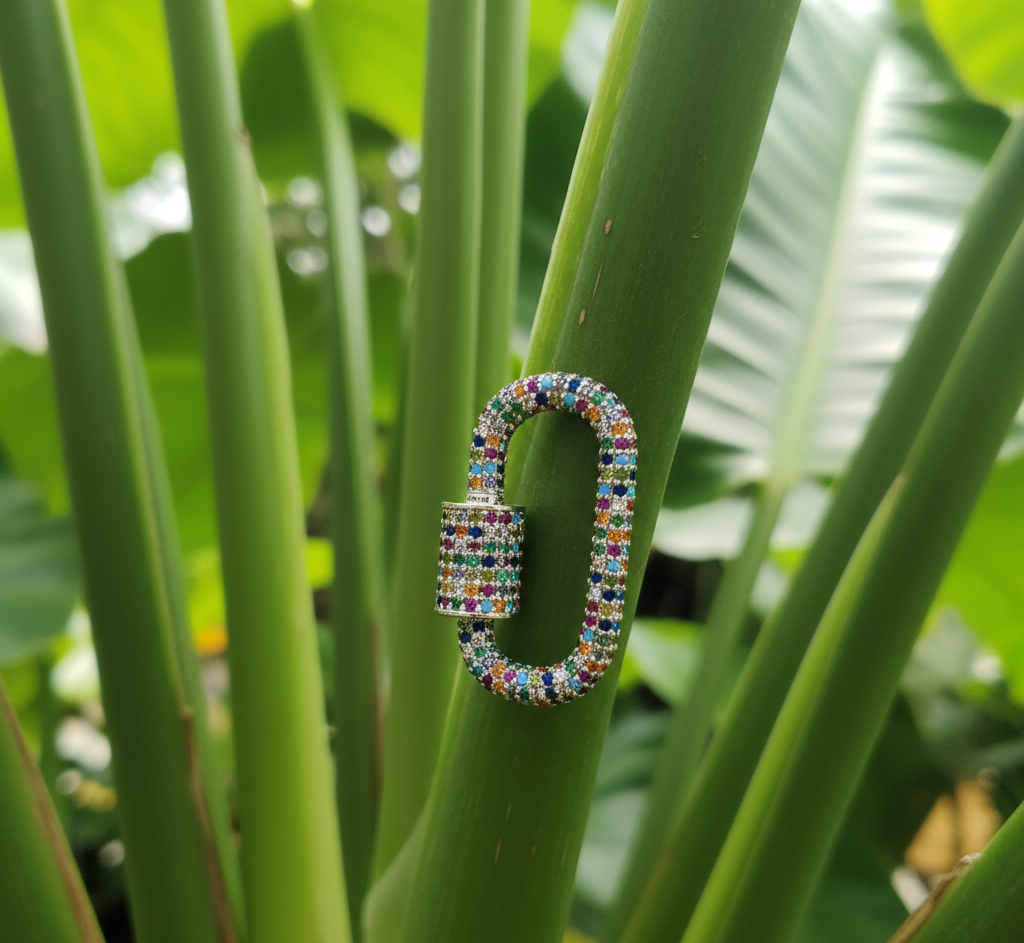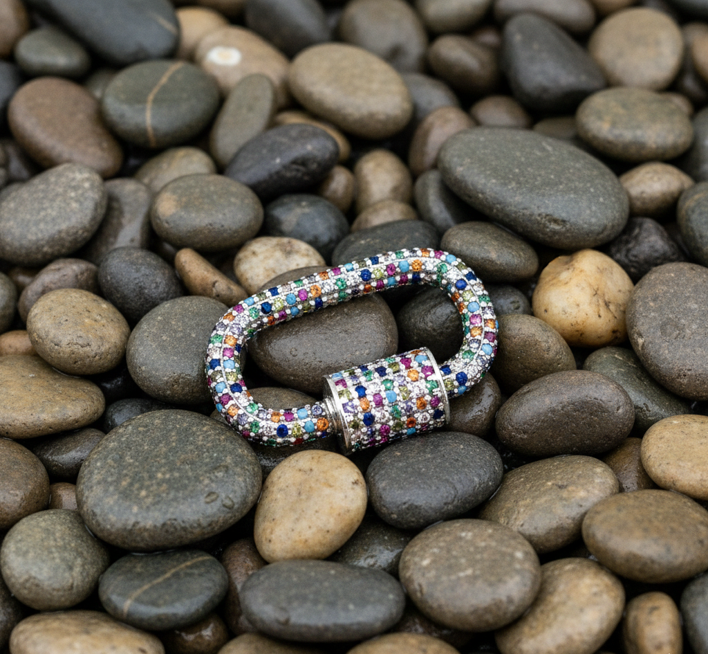 Add a touch of sparkle and versatility to your jewelry collection with this elegant Carabiner Lock Screw Connector Charm, beautifully crafted from 925 Sterling Silver and adorned with dazzling multi-color Cubic Zirconia (CZ) stones. Designed with both style and functionality in mind, this connector charm is perfect for enhancing necklaces, bracelets, and charm chains.