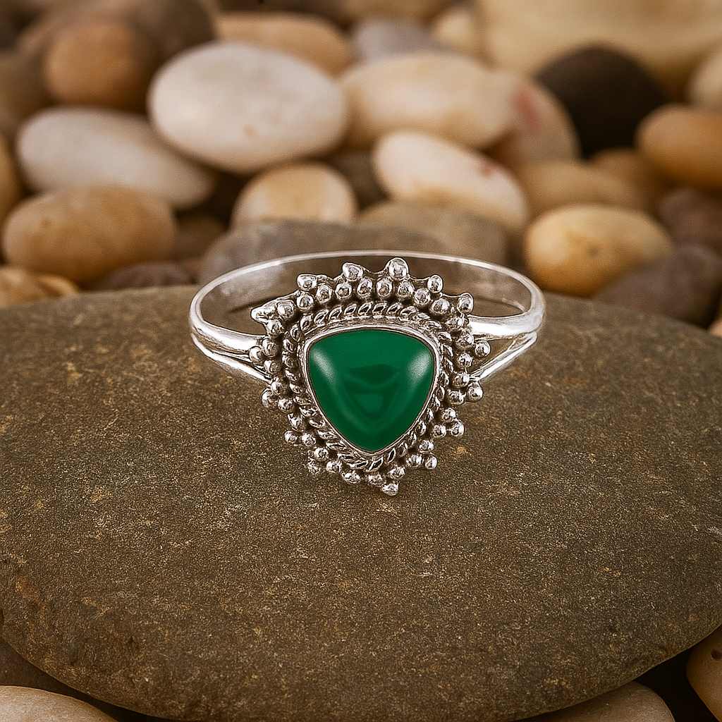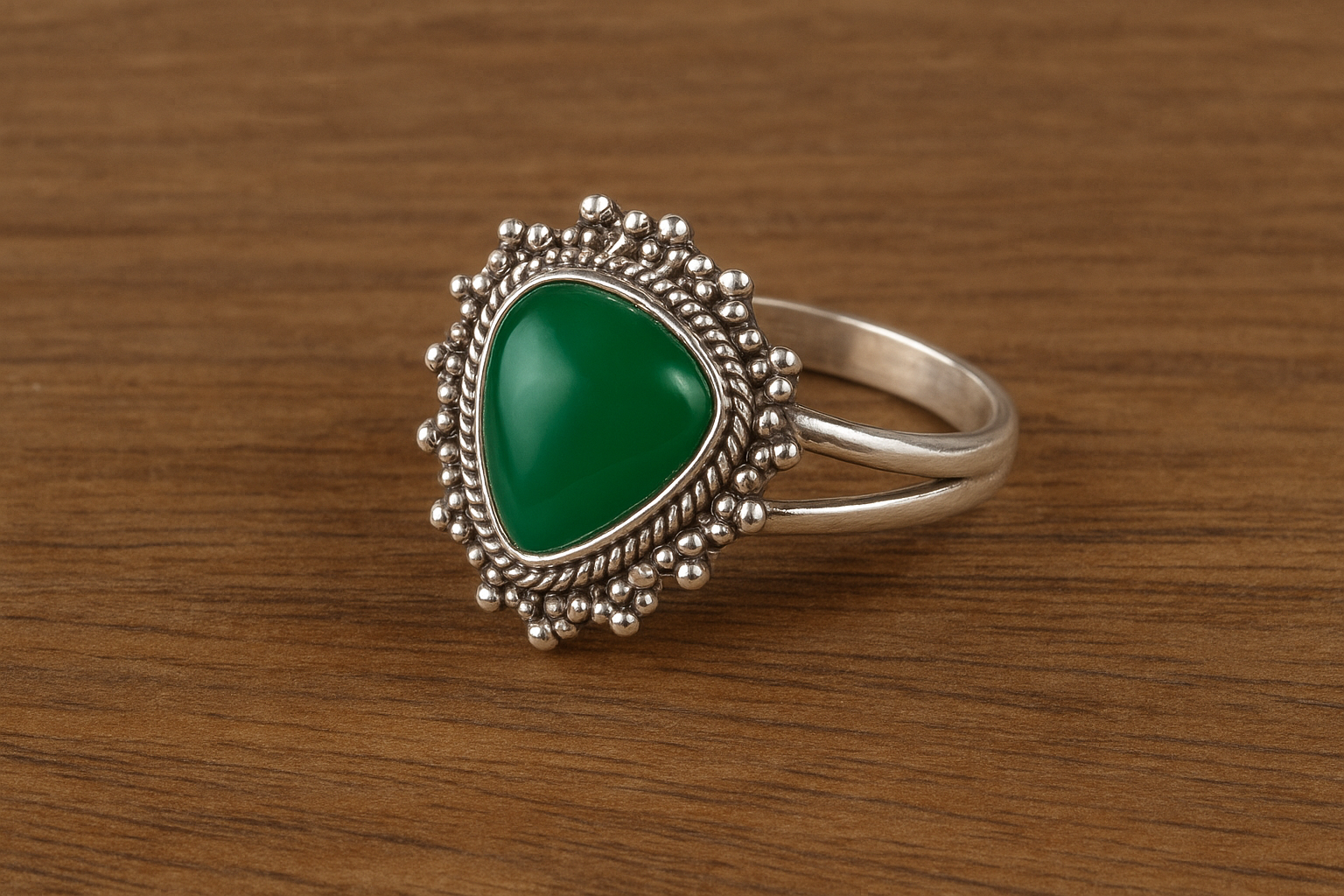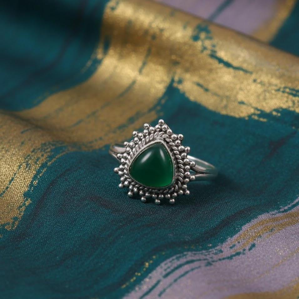 Welcome to Shri Shyam Gems and Jewelry, where elegance meets craftsmanship. Our Green Onyx Gemstone Ring, set in 925 sterling silver, is designed to add a touch of sophistication to any outfit.