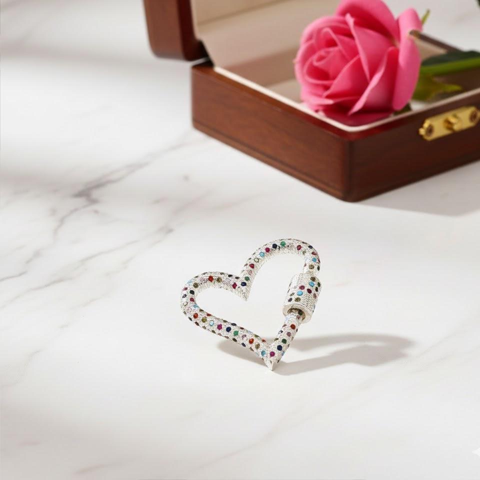 The lock is adorned with sparkling multi-color cubic zirconia (CZ) stones, giving it a vibrant and eye-catching appearance. Its unique heart design symbolizes love and elegance, while the carabiner mechanism allows you to easily attach it to necklaces, bracelets, or charm holders. You can use it to connect chains, add charms, or create your own personalized jewelry piece.