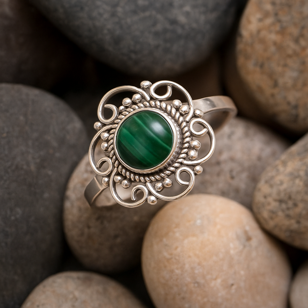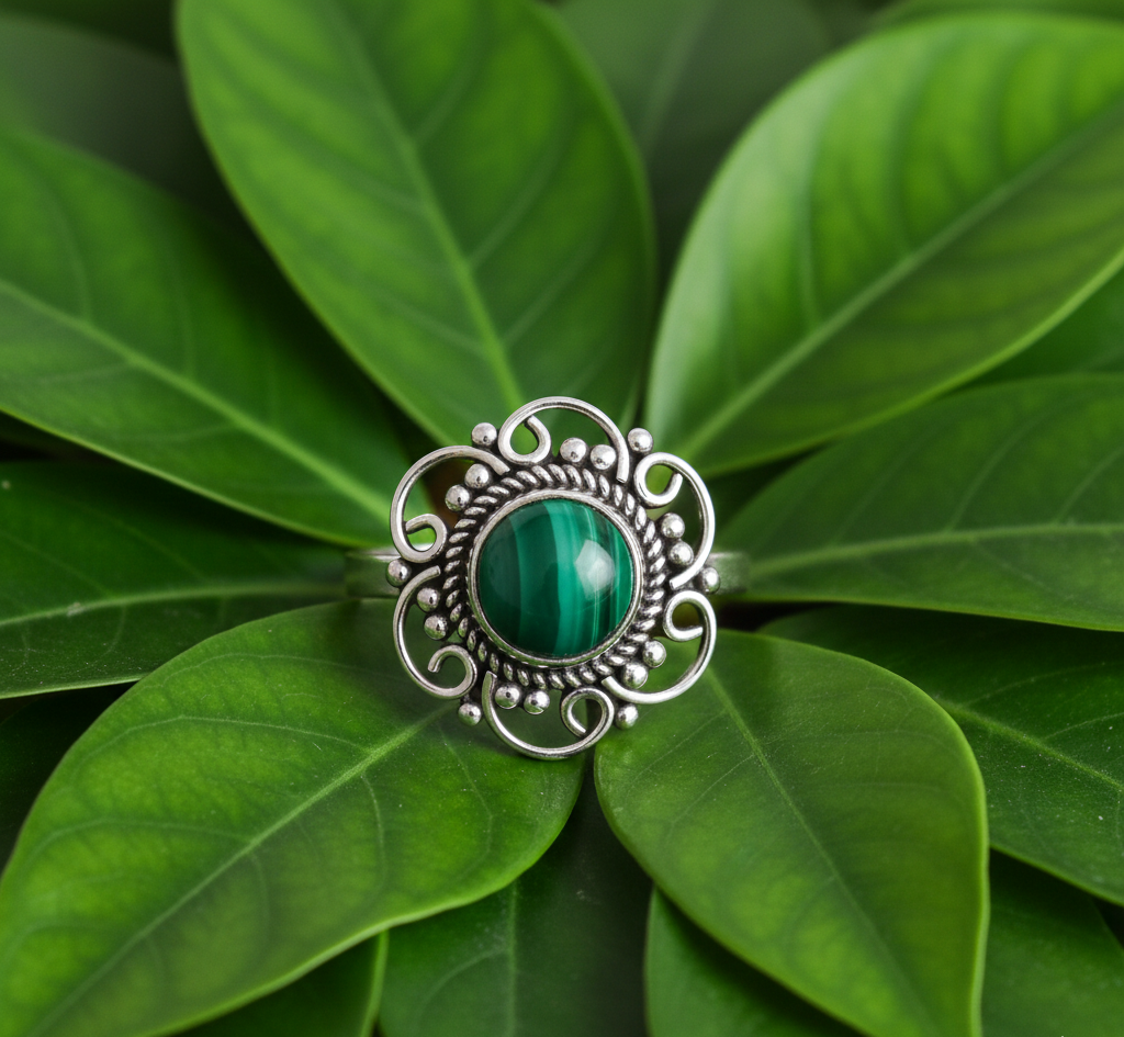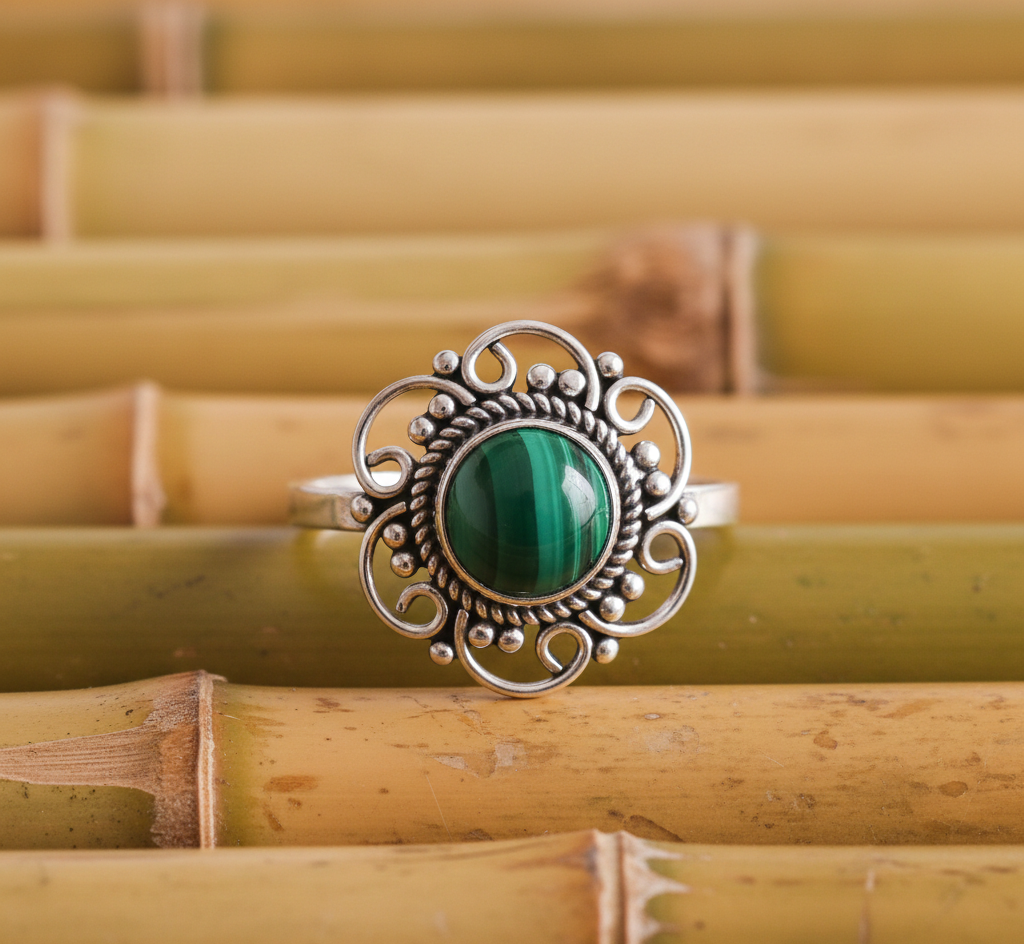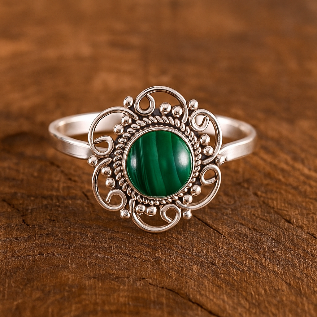 Welcome to Shri Shyam Gems and Jewelry, where elegance meets craftsmanship. Our Malachite Gemstone Ring, set in 925 sterling silver, is designed to add a touch of sophistication to any outfit.